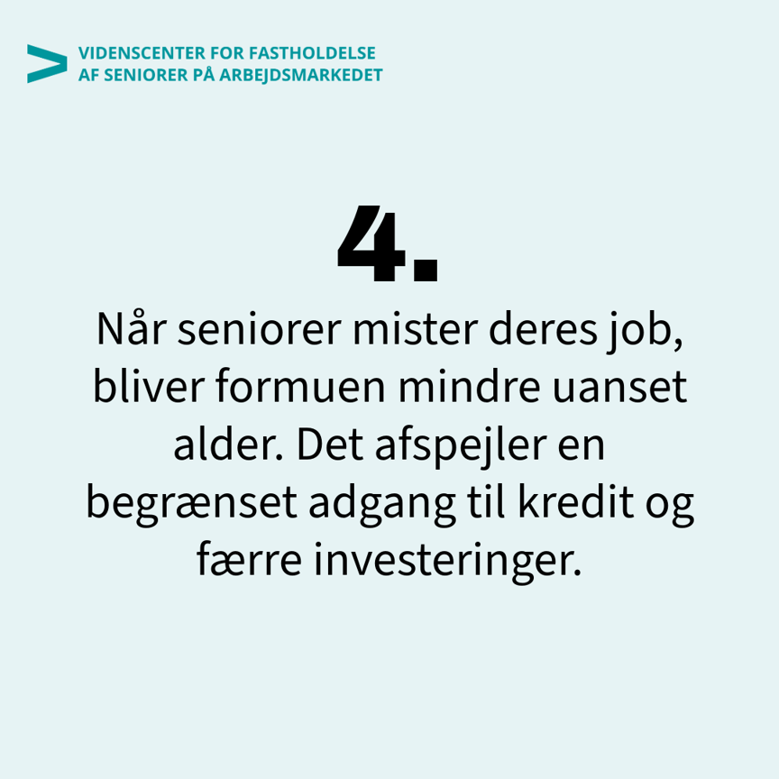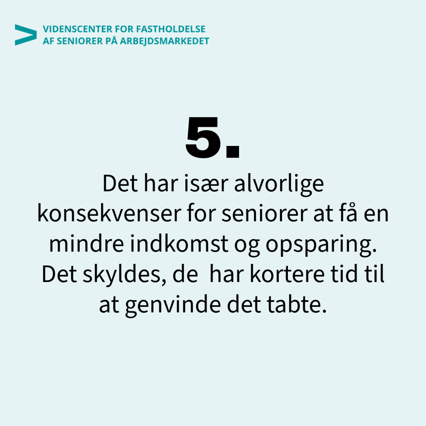 Studiet peger også på, at der er forskel på, at alder spiller en rolle, hvis seniorer mister deres job. En faldende indkomst og en mindre opsparing har især alvorlige konsekvenser for personer tæt på folkepensionsalderen, som i dag er 67 år, fordi de har kortere tid til at genvinde det tabte.