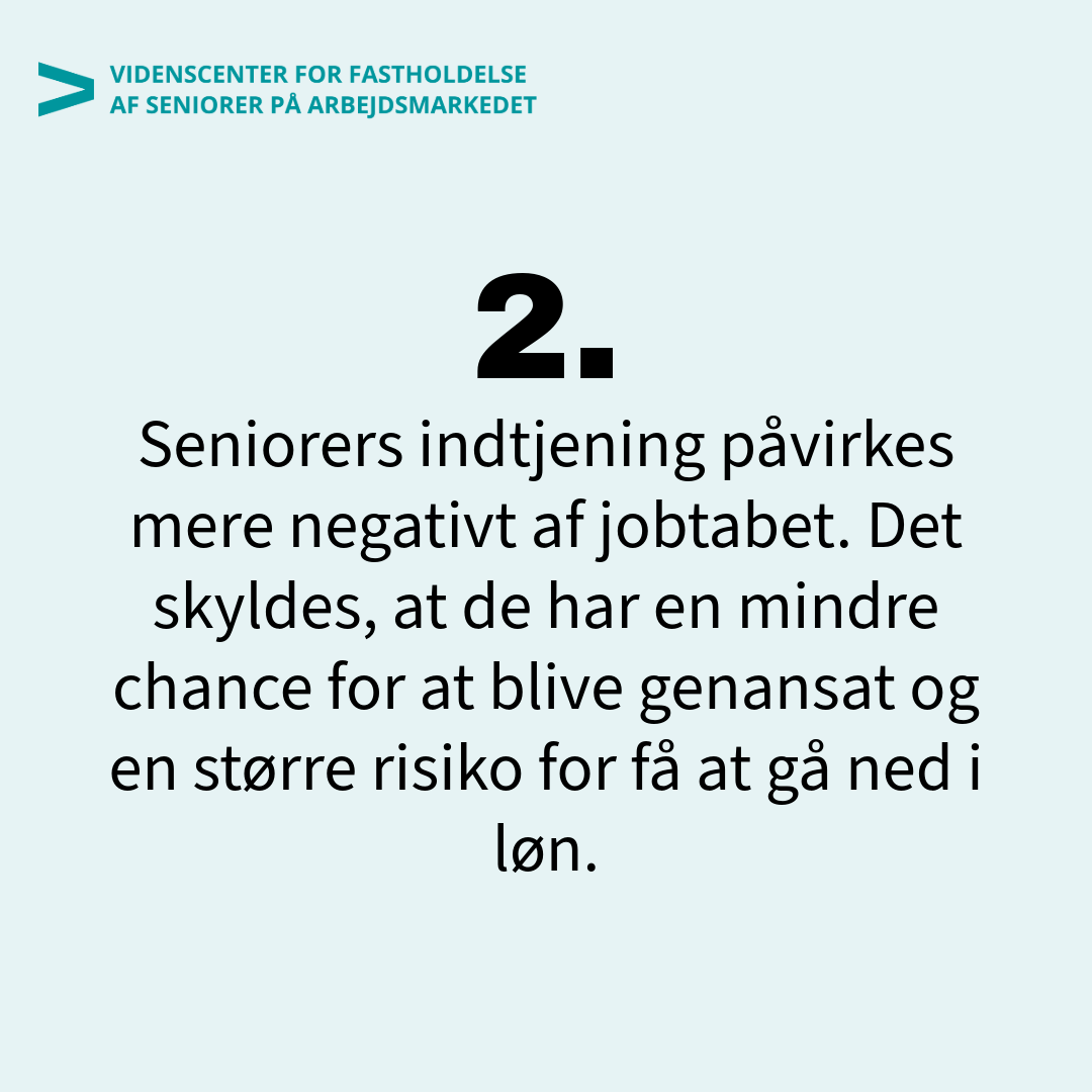Studiet peger også på, at der er forskel på, at alder spiller en rolle, hvis seniorer mister deres job. En faldende indkomst og en mindre opsparing har især alvorlige konsekvenser for personer tæt på folkepensionsalderen, som i dag er 67 år, fordi de har kortere tid til at genvinde det tabte.