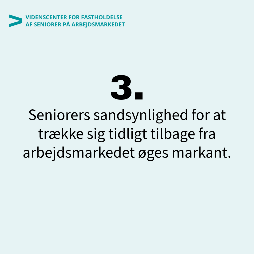 Resultaterne viser, at det kan tage længere tid for dem at finde et arbejde igen sammenlignet med yngre aldersgrupper, og at risikoen for at seniorerne trækker sig tidligt fra arbejdsmarkedet øges markant.
